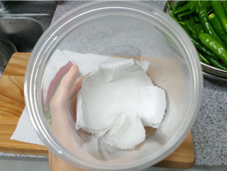 냉장보관할 용기 바닥에 키친타올을 깔아줍니다