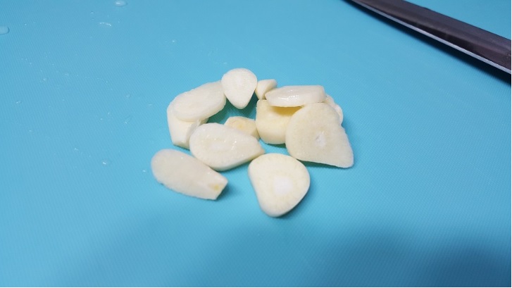 시원하고 깔끔한 맛을 위해 마늘은 이렇게 편으로 썰어서 준비해줍니다