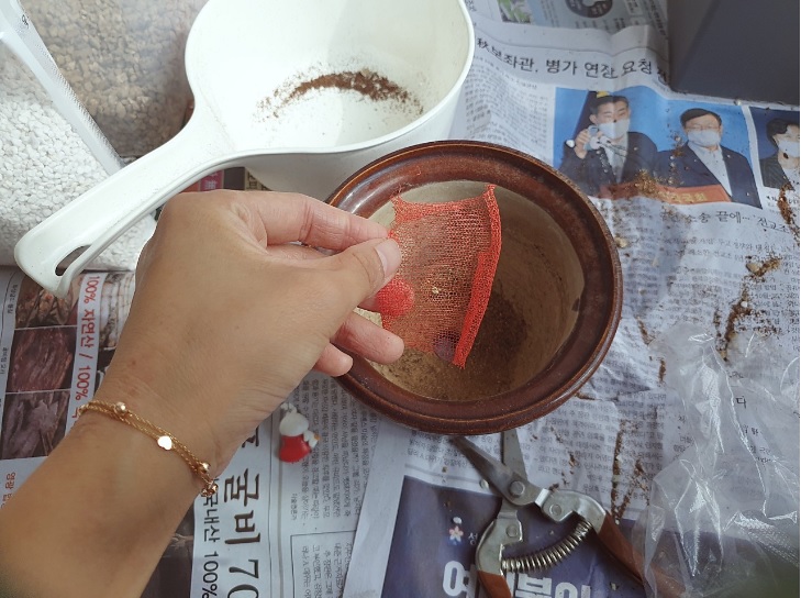 양파망 위에 필요한 흙을 채워 분갈이해주세요~