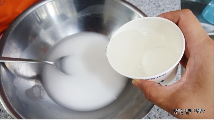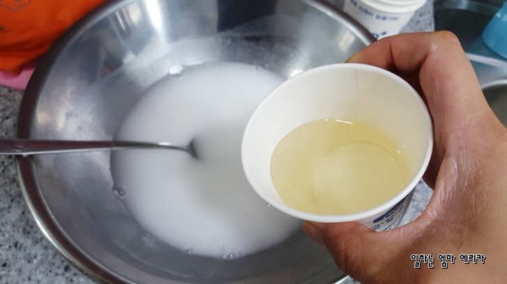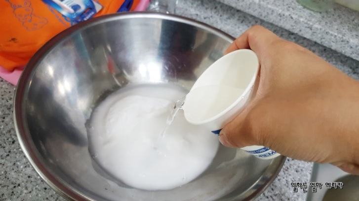 주방세제를 한컵 붓고 또 잘 저어주세요