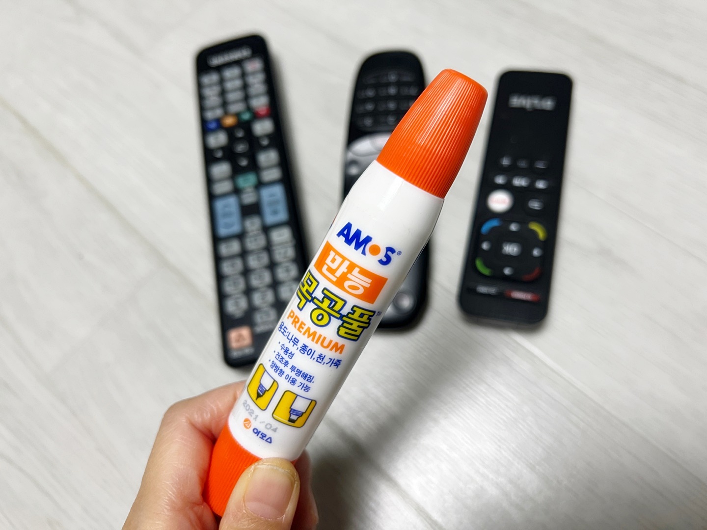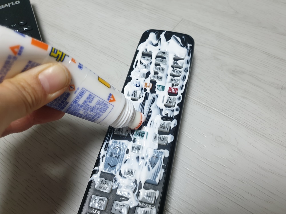 목공풀을 리모컨의 앞부분에 펴 발라주시는데요
