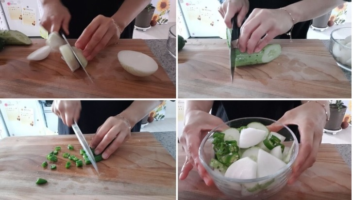 1. 양파와 오이, 청양고추를 먹기 좋은 크기로 썰어줍니다