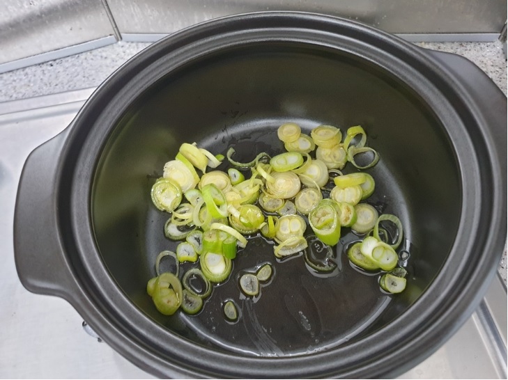참기름 2숟갈 넣고 달달 볶으며 파기름을 내주세요