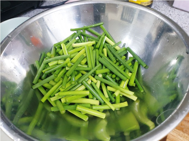 찬물에 손질한 마늘쫑을 담아두고