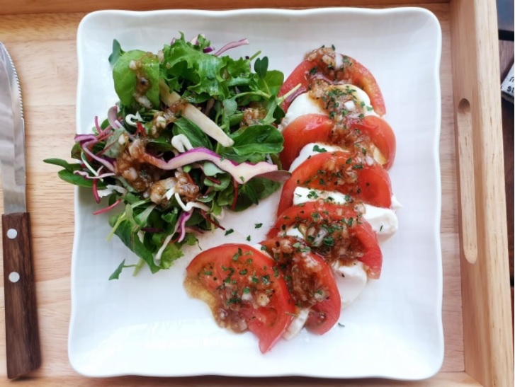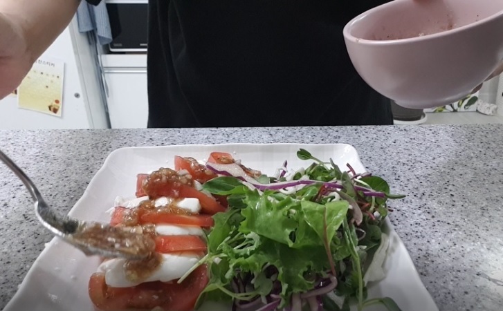 보통 카프레제 만들 땐 치즈와 토마토 그리고 발사믹 소스를 곁들여 만드는데요