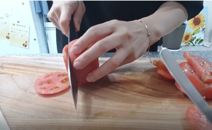 소스 준비를 마쳤으니 토마토도 썰어서 준비해 줄게요