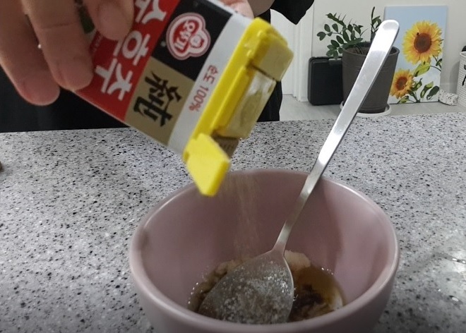 설탕 1/3 숟갈, 소금한 꼬집을 넣어서 섞어줍니다.