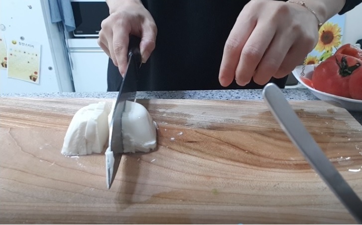 보통 토마토카프레제에는 생 모차렐라 치즈를 곁들여 먹는데