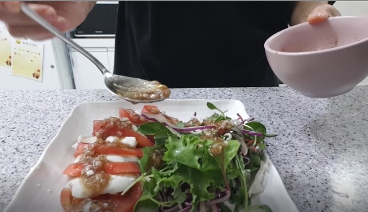 아까 만들어둔 발사믹드레싱을 골고루 얹어줍니다