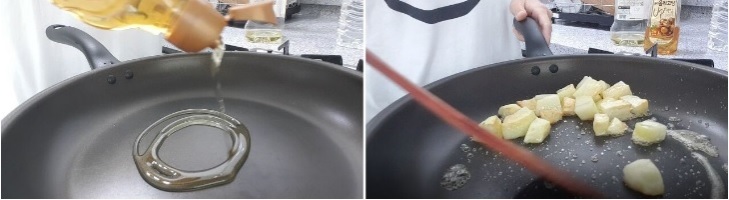 팬에 기름을 두르고 중불에 달군 뒤 감자를 넣어줍니다