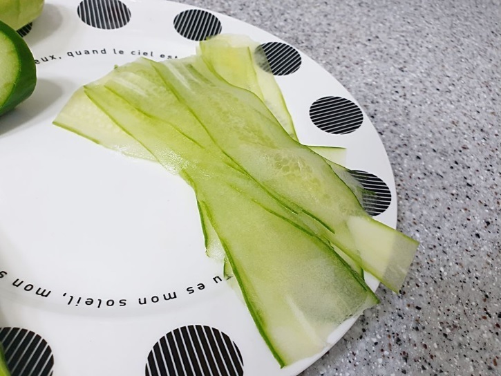 필러로 오이를 얇게 밀어서 준비해 주세요