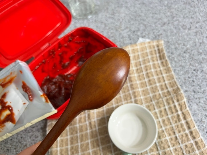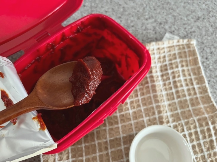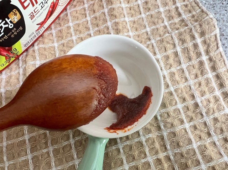 움푹 들어간 숟가락에 고추장이 잔뜩 묻어서