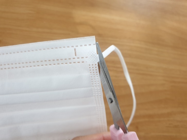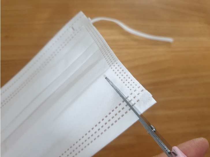 잘라낸 마스크끈 하나로 개봉된 부분을 잘 묶어서