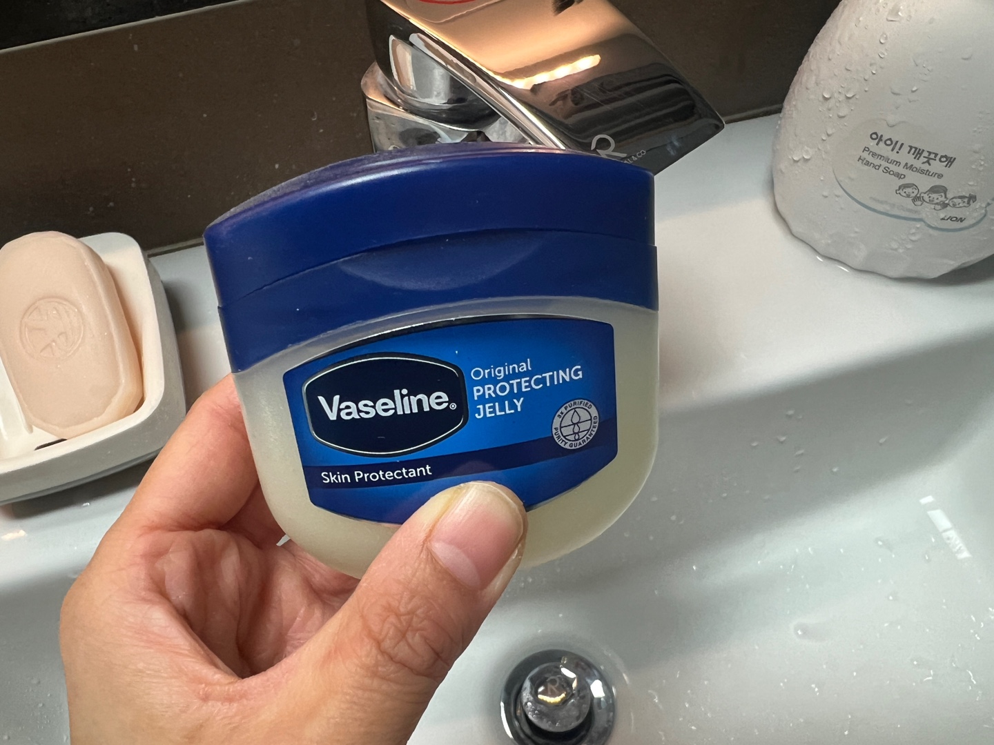 바세린의 파라핀유 기름 성분이 수전을 코팅해 주는 효과가 있어요.