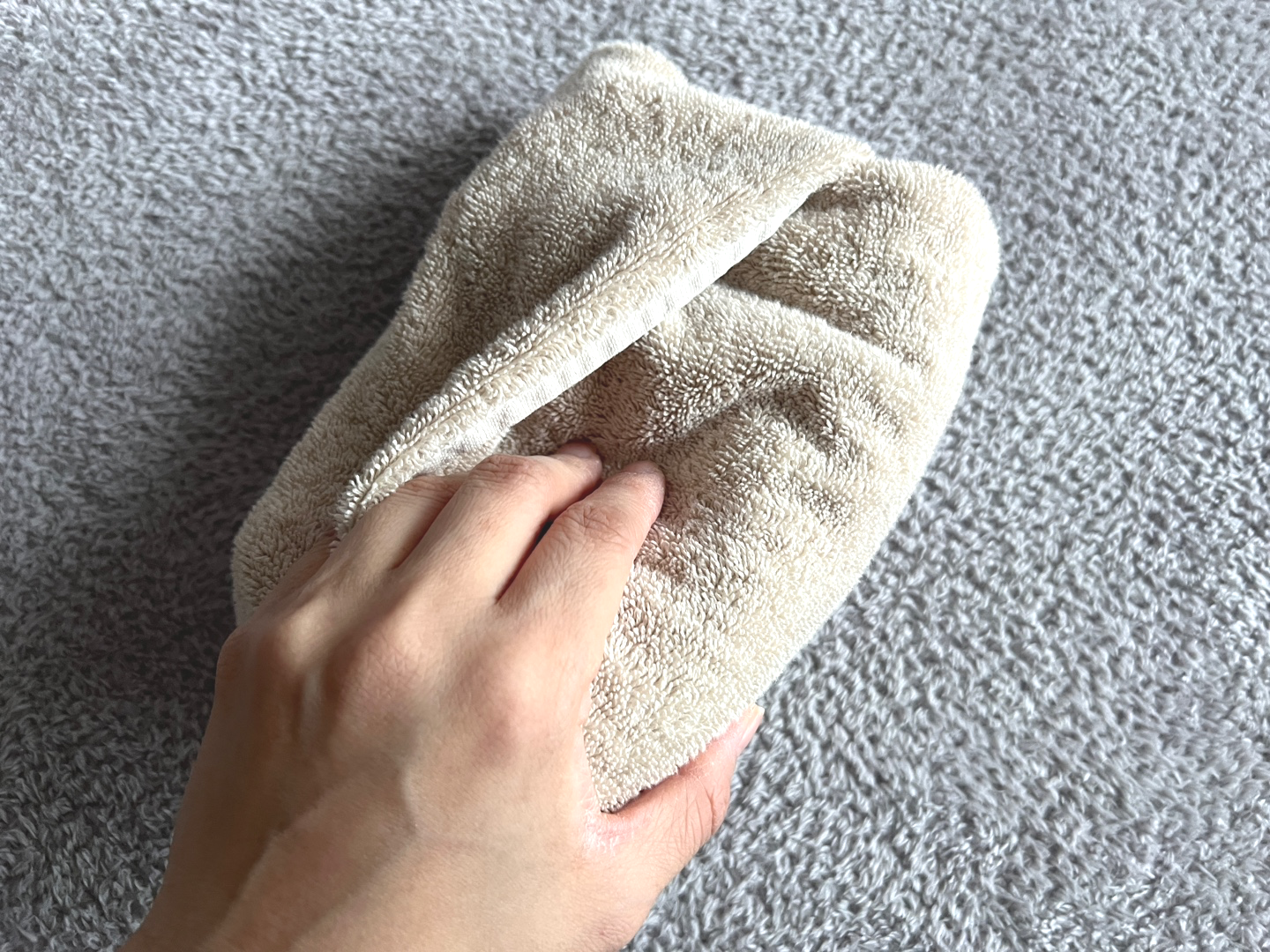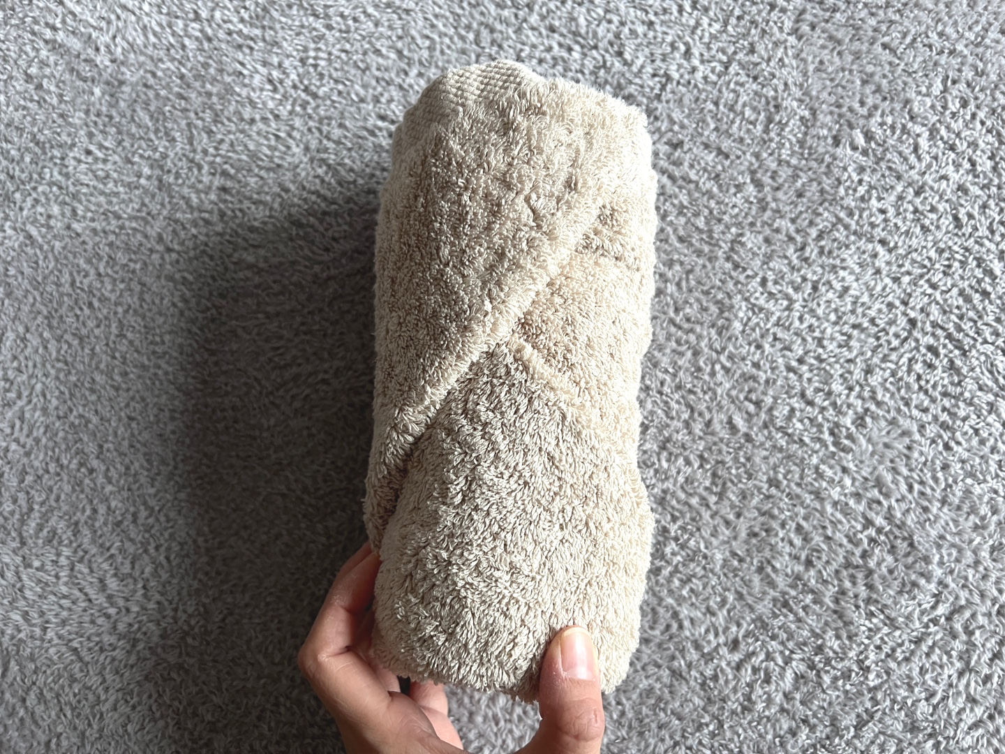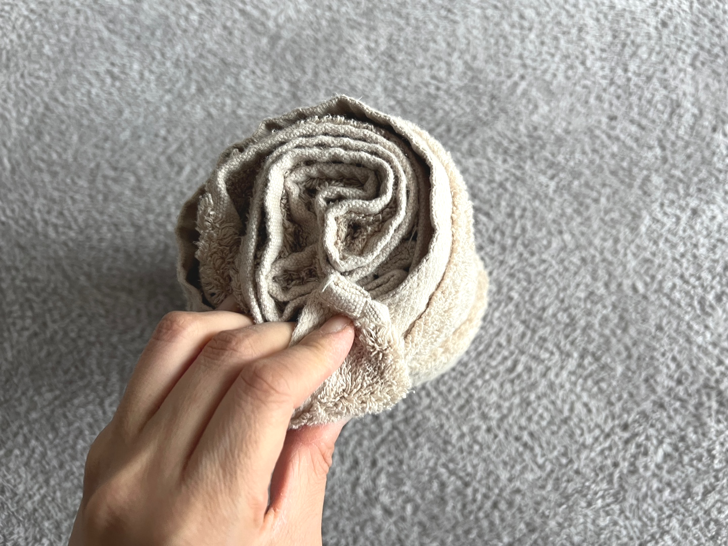 저처럼 도톰한 수건이라면 힘을 주어 단단하게 말아 올려줍니다