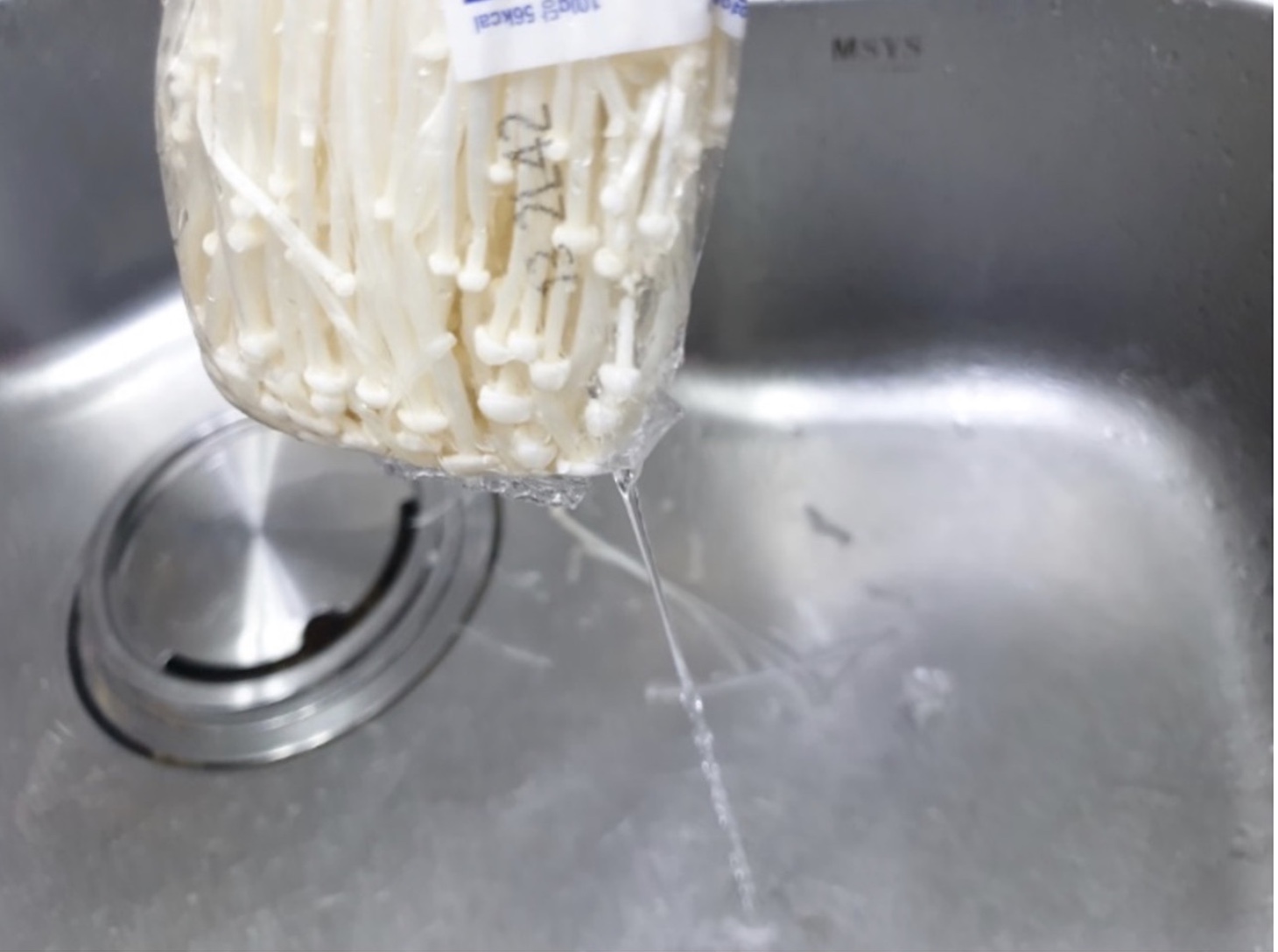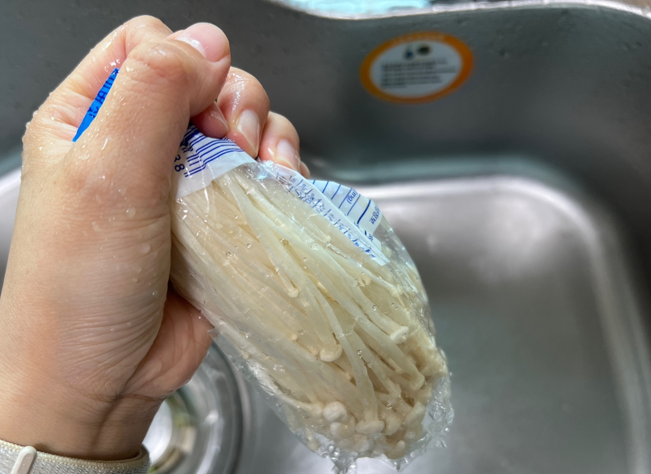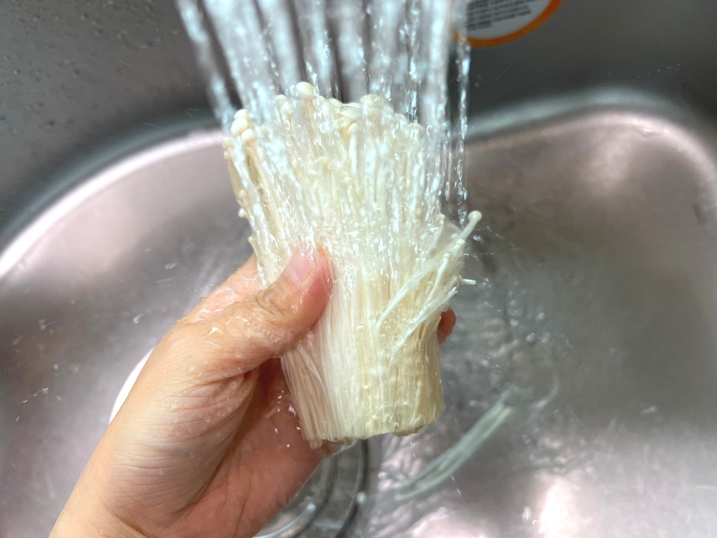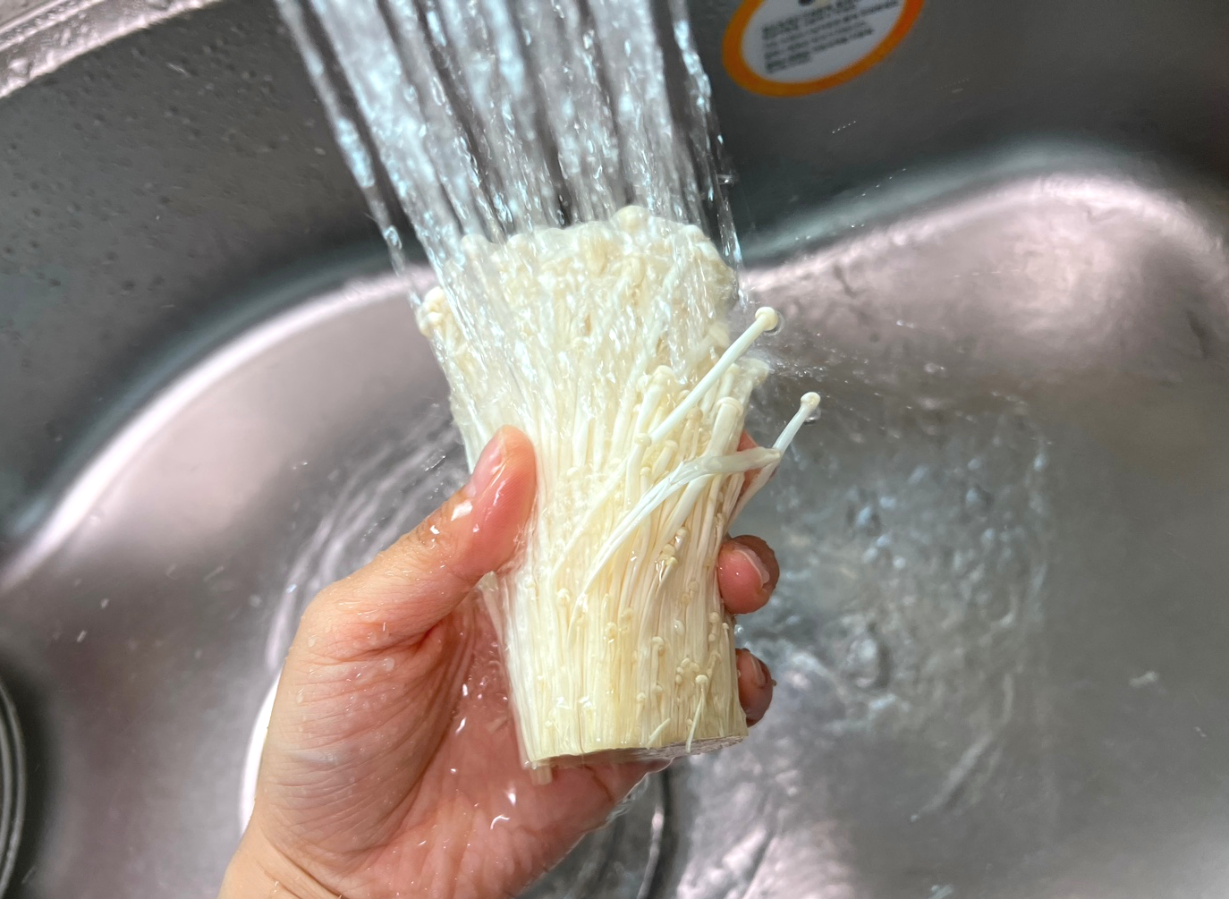 그래서 팽이버섯을 꺼내서 흐르는 물에 헹궈주게 되는데요