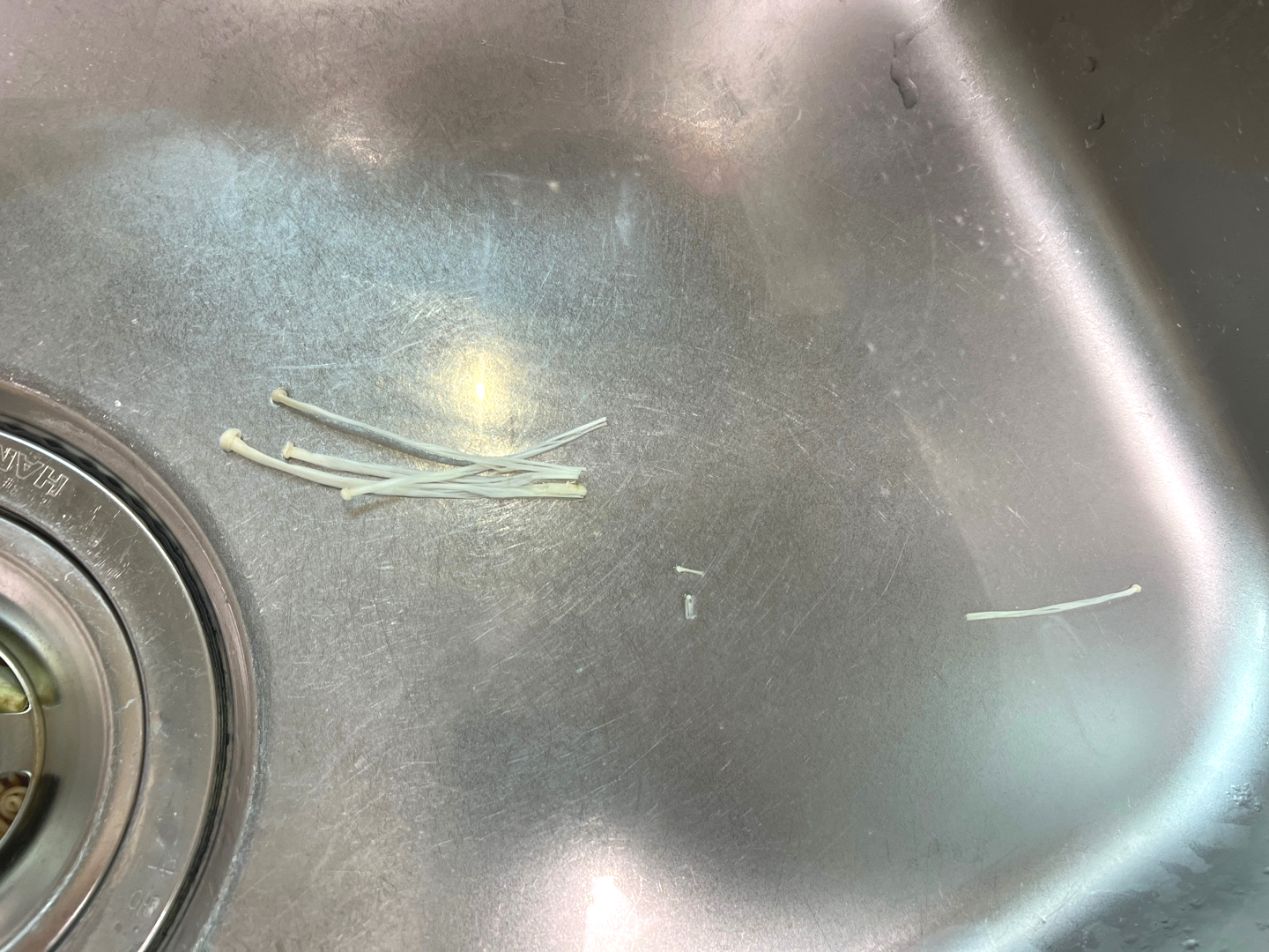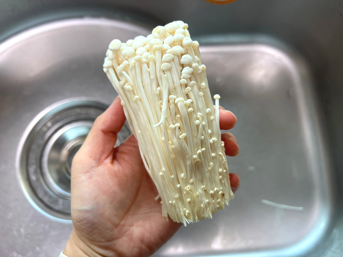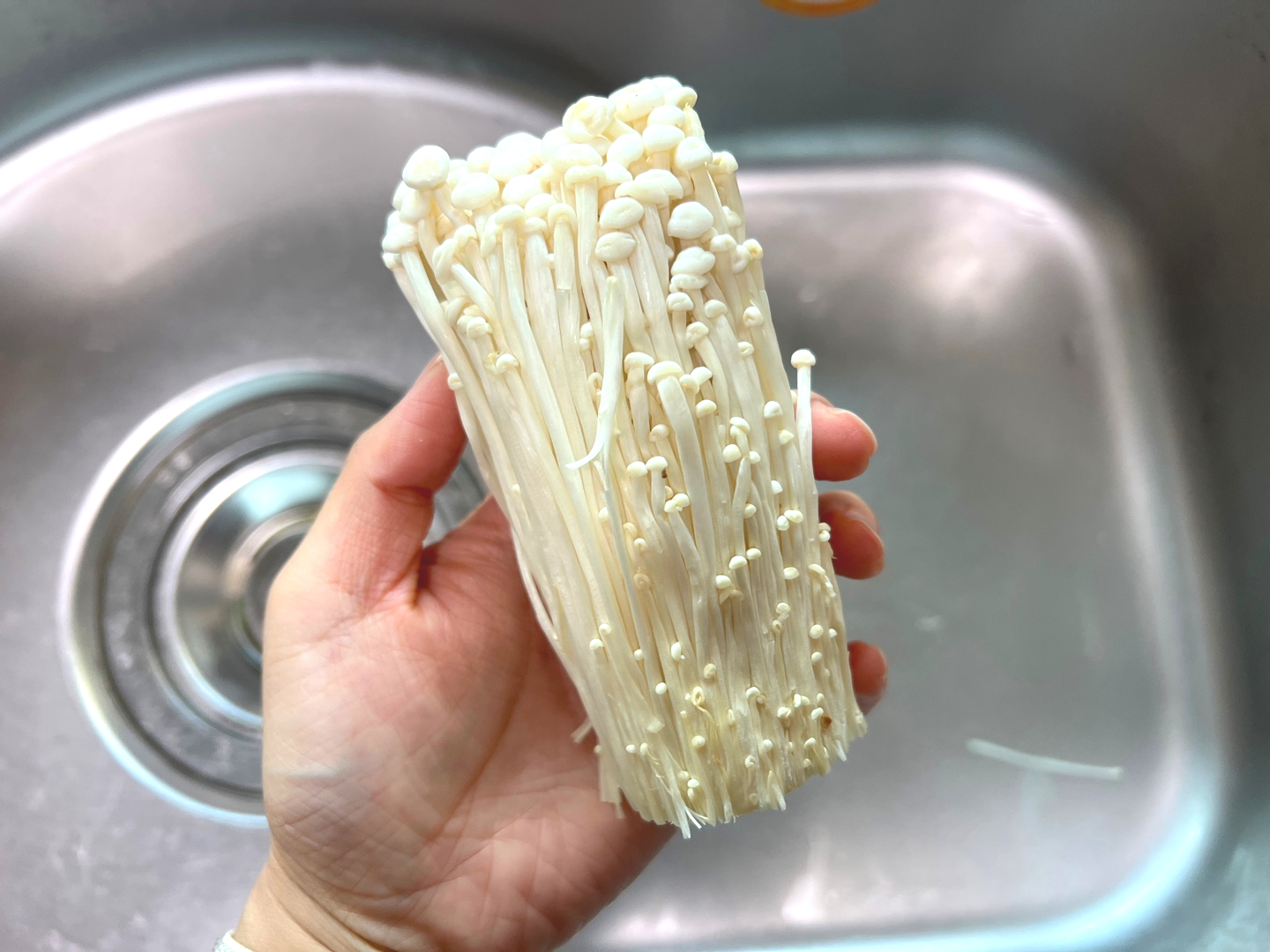 그래서 팽이버섯을 꺼내서 흐르는 물에 헹궈주게 되는데요