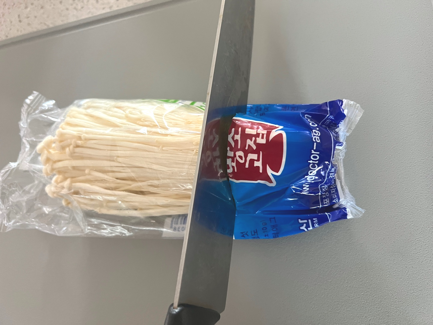 이때 봉지를 뜯고 팽이버섯을 꺼내서 밑동을 잘라주시는 분들이 많으시더라고요.