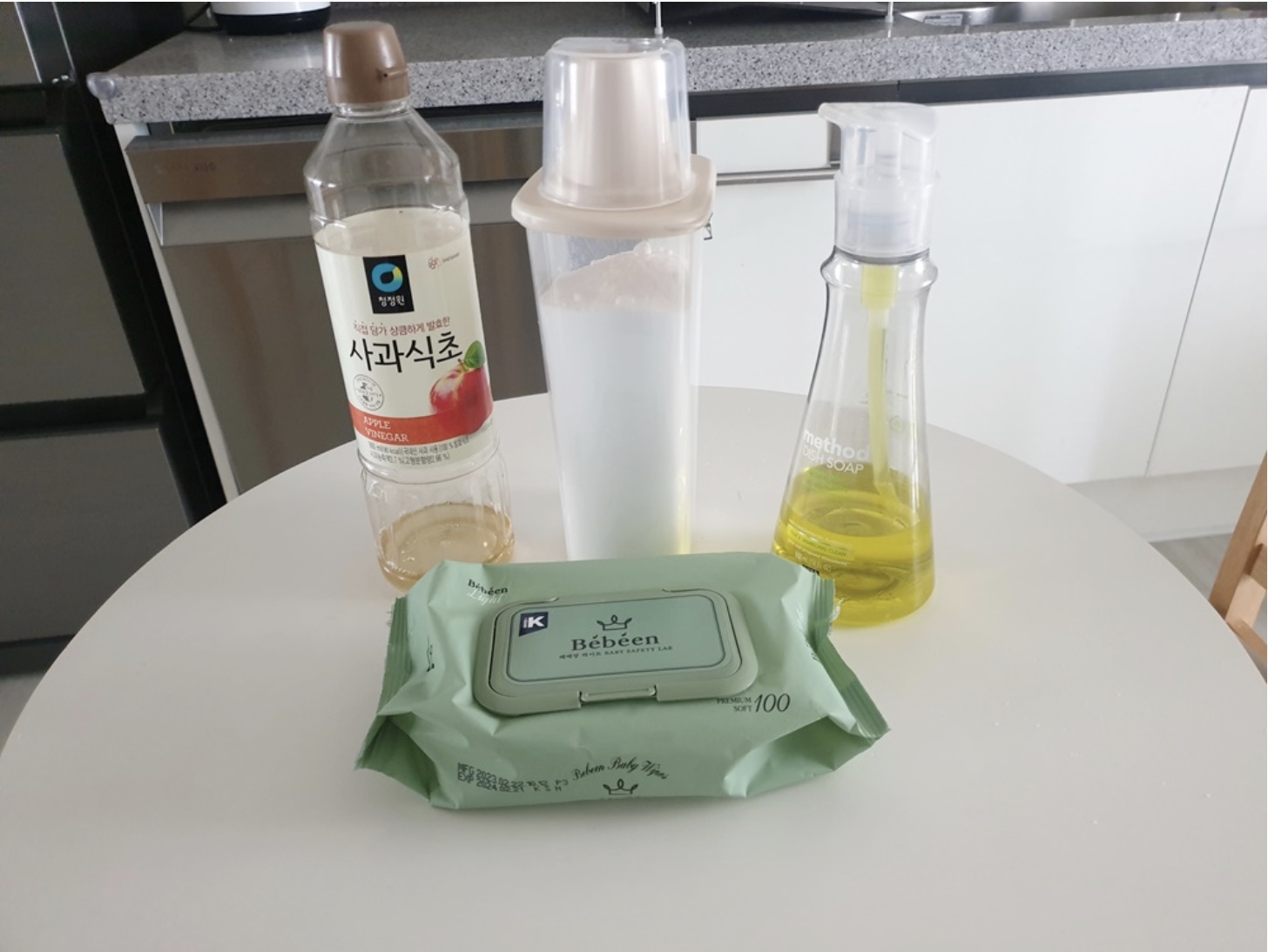 재료 : 물티슈, 베이킹소다, 주방세제, 식초