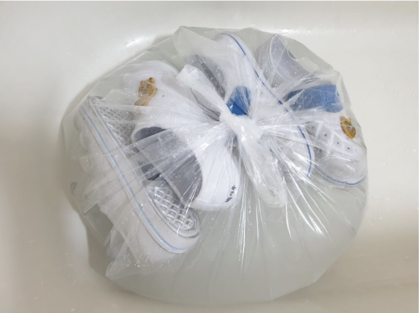 비닐에 따뜻한 온수를 넣고 운동화가 다 잠기게 해 줍니다.