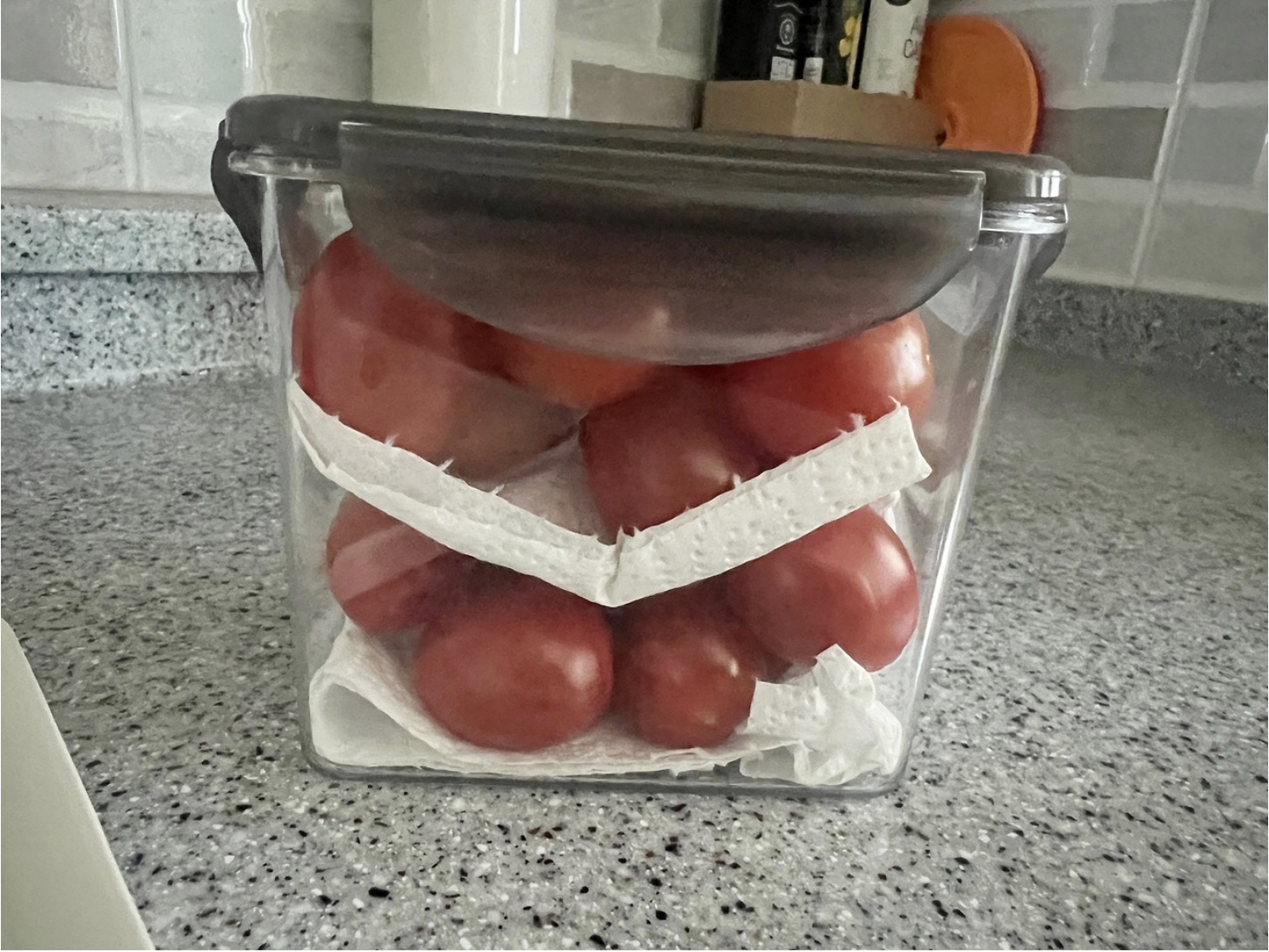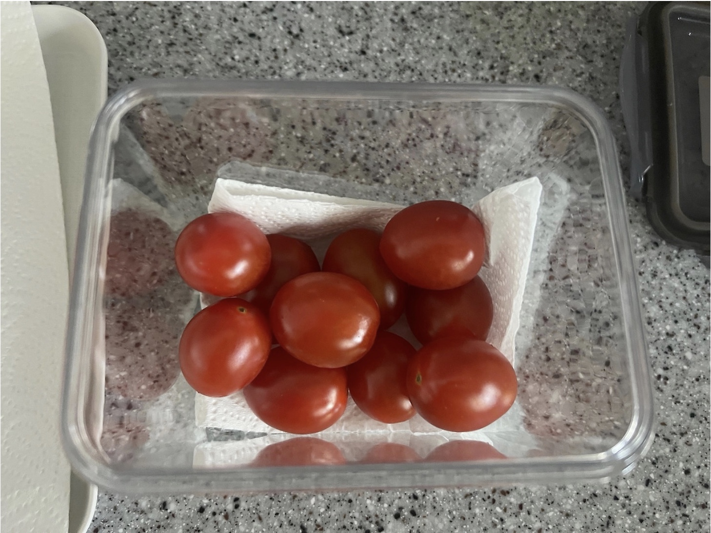 밀폐용기에 키친타월 두세장 정도 깔아주고 방울토마토를 넣고
