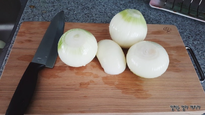 양파는 깨끗하게 씻어 먹기 좋게 손질해줍니다.