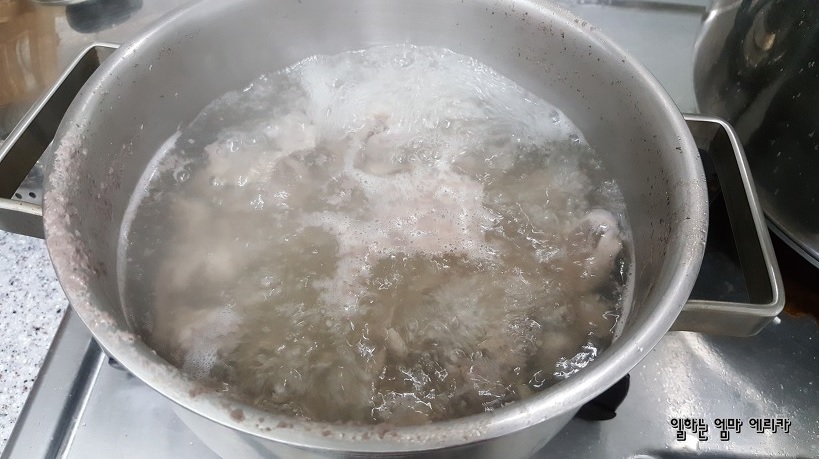 손질된 닭근위는 끓는 물에 한번 데쳐줍니다