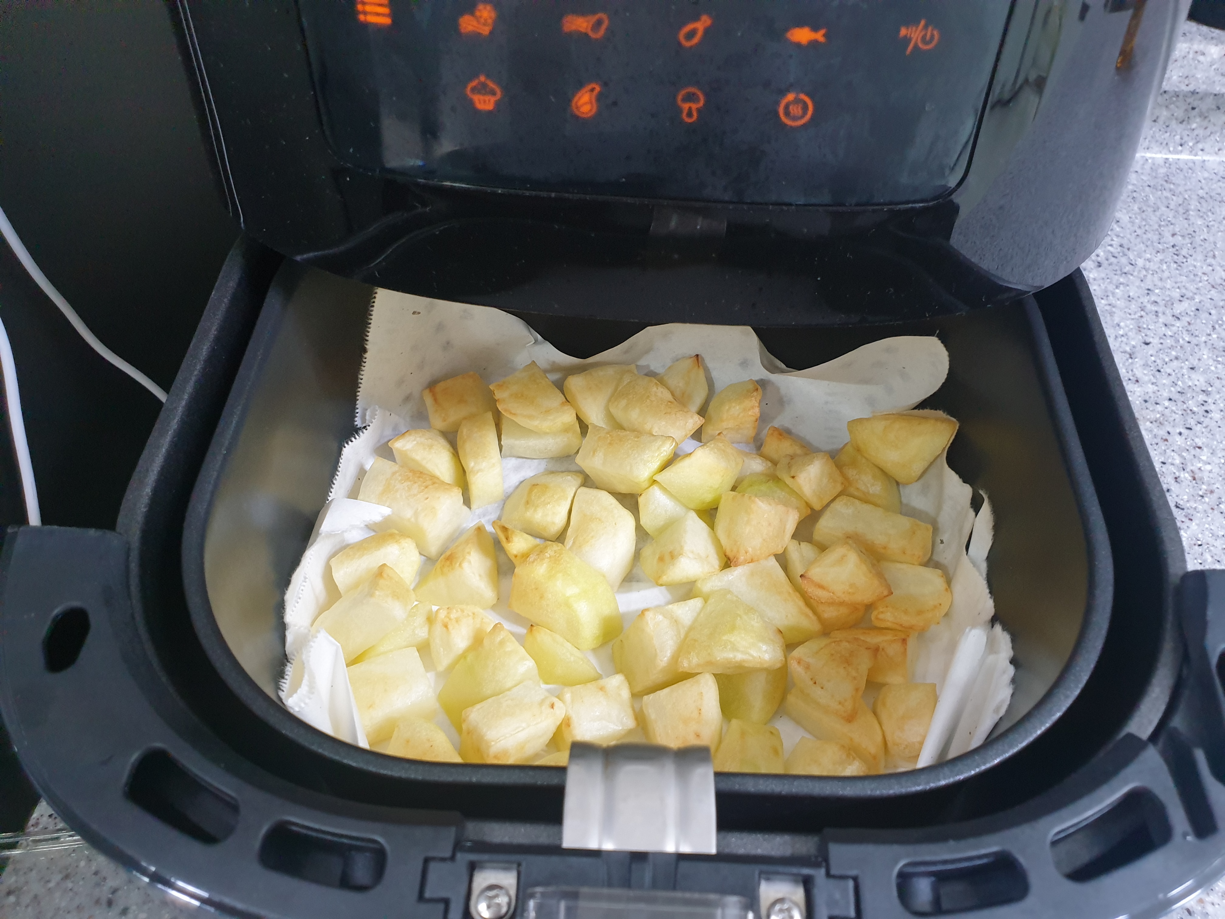 에어프라이어에 기름종이를 깔아줍니다