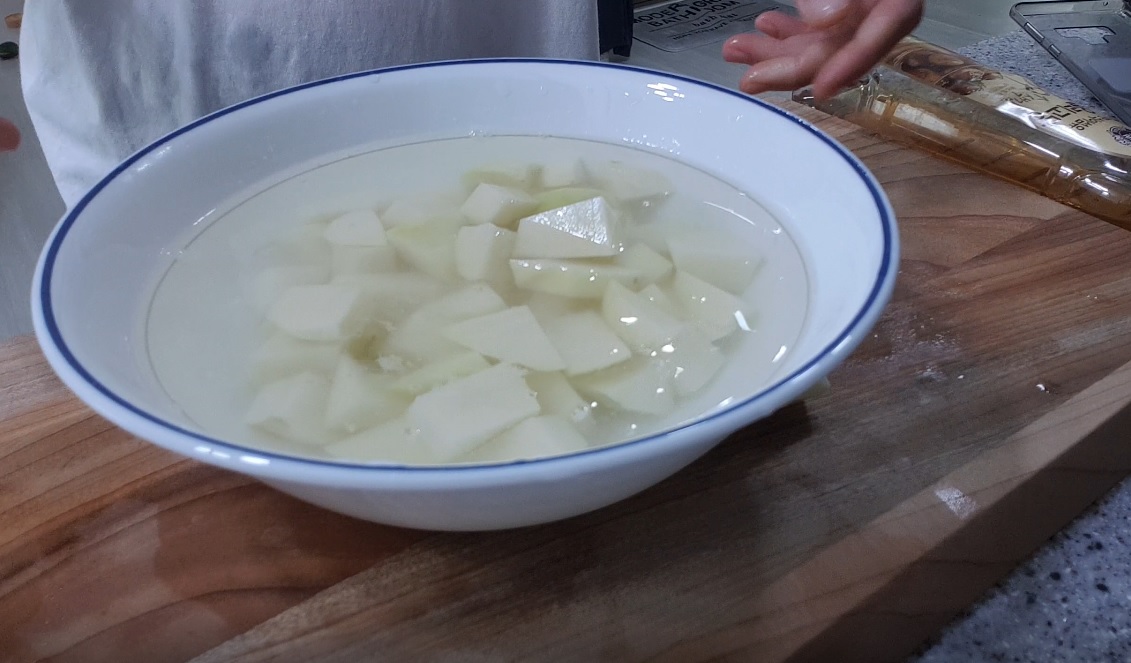 썰어둔 감자는 찬물에 10분 정도 담가서