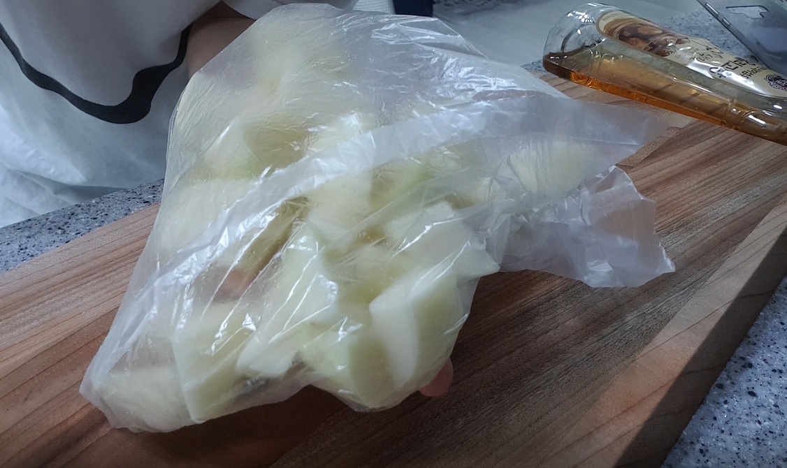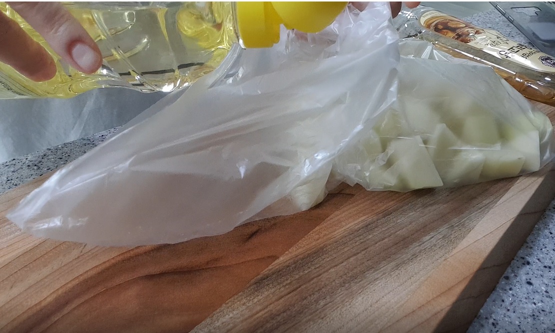 물기를 제거한 감자는 위생백에 담아 식용유를 몇방울 떨어뜨려줍니다.