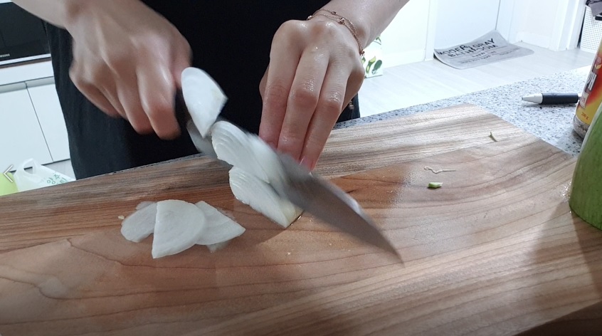 애호박과 같은 크기로 양파반개도 채썰어 준비합니다.
