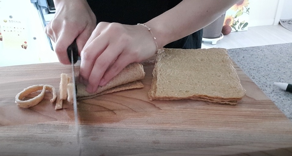 사각어묵을 흐르는 물에 씻은 뒤 키친타올로 물기를 제거해주었어요