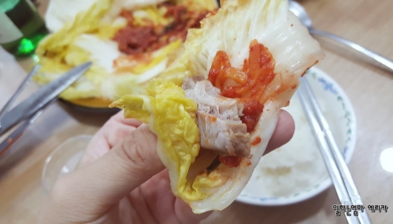 이렇게 수육에 배추속 넣고 한입에 쏙~ 술이 술술 넘어가고