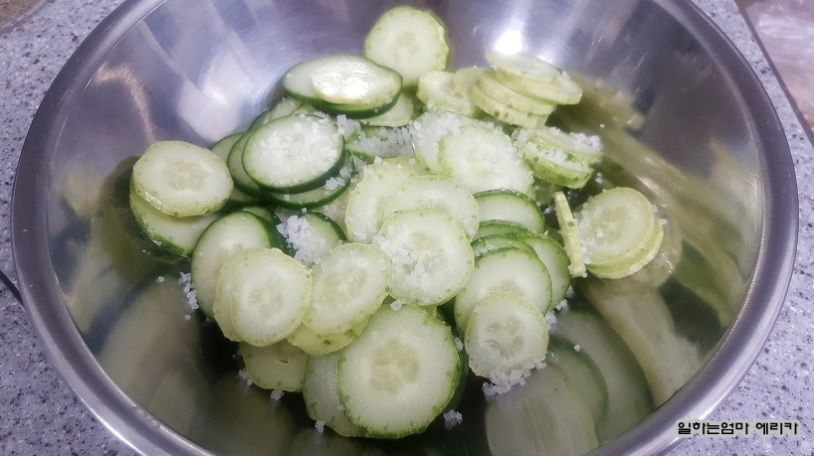 오이는 얇게 썰어서 굵은 소금을 넣고 30분 정도 절여줍니다